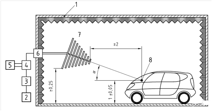 整车辐射抗扰度测试(RI) ISO 11451-2 0.01MHz-18GHz 100V/m E/emark 20MHz-2GHz 30V/m 整车的车外源辐射抗扰度(RI)试验是汽车 EMC 的一个重要测试项目,依据国际标准 ISO 11451-2 。E/e